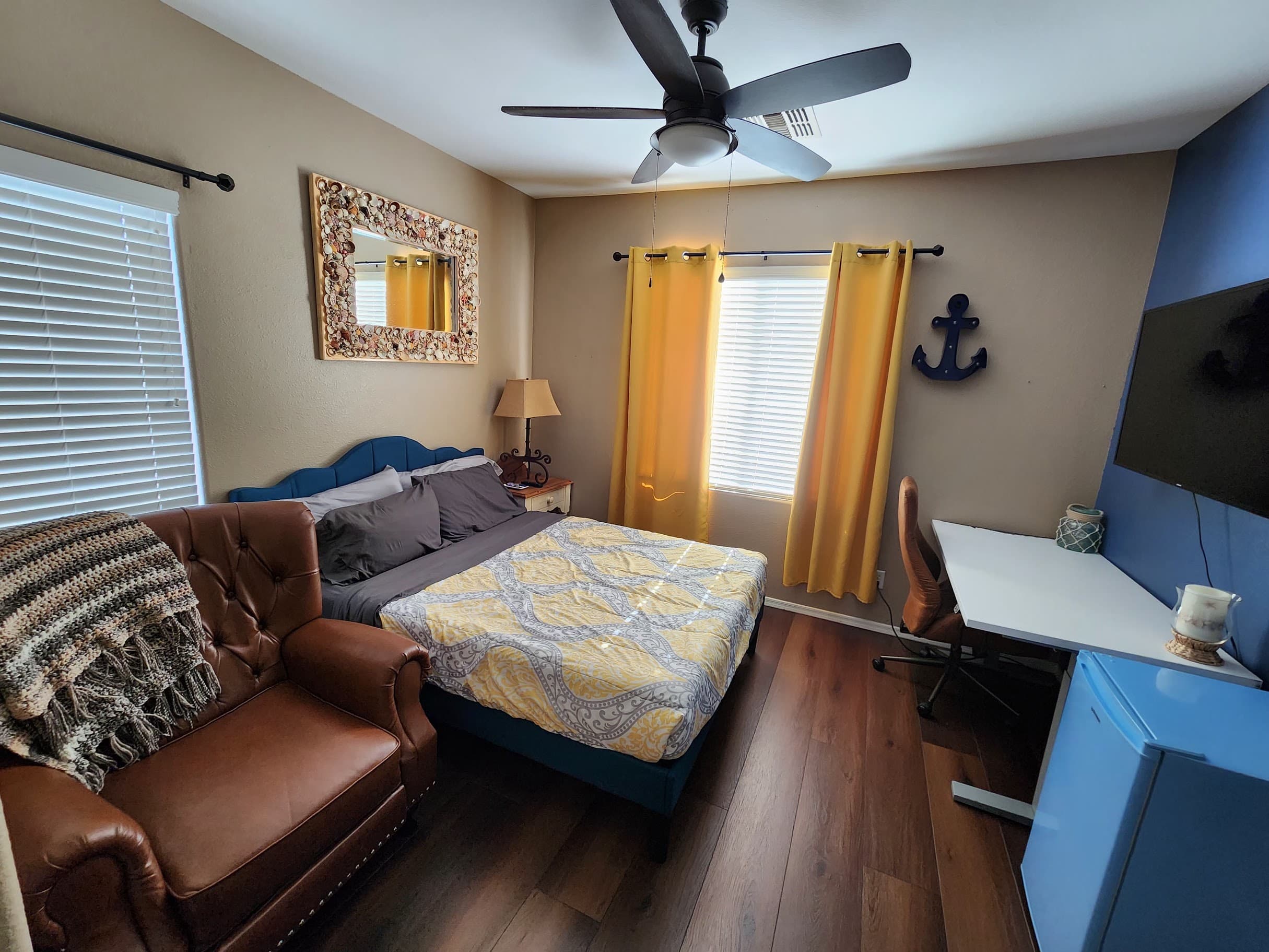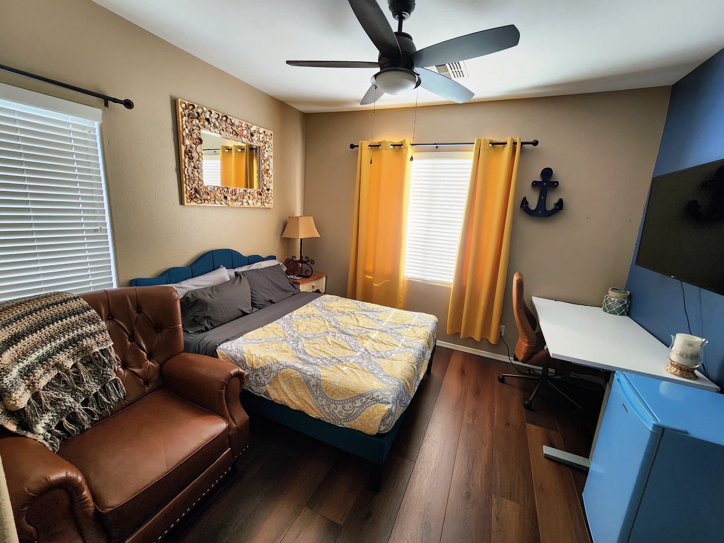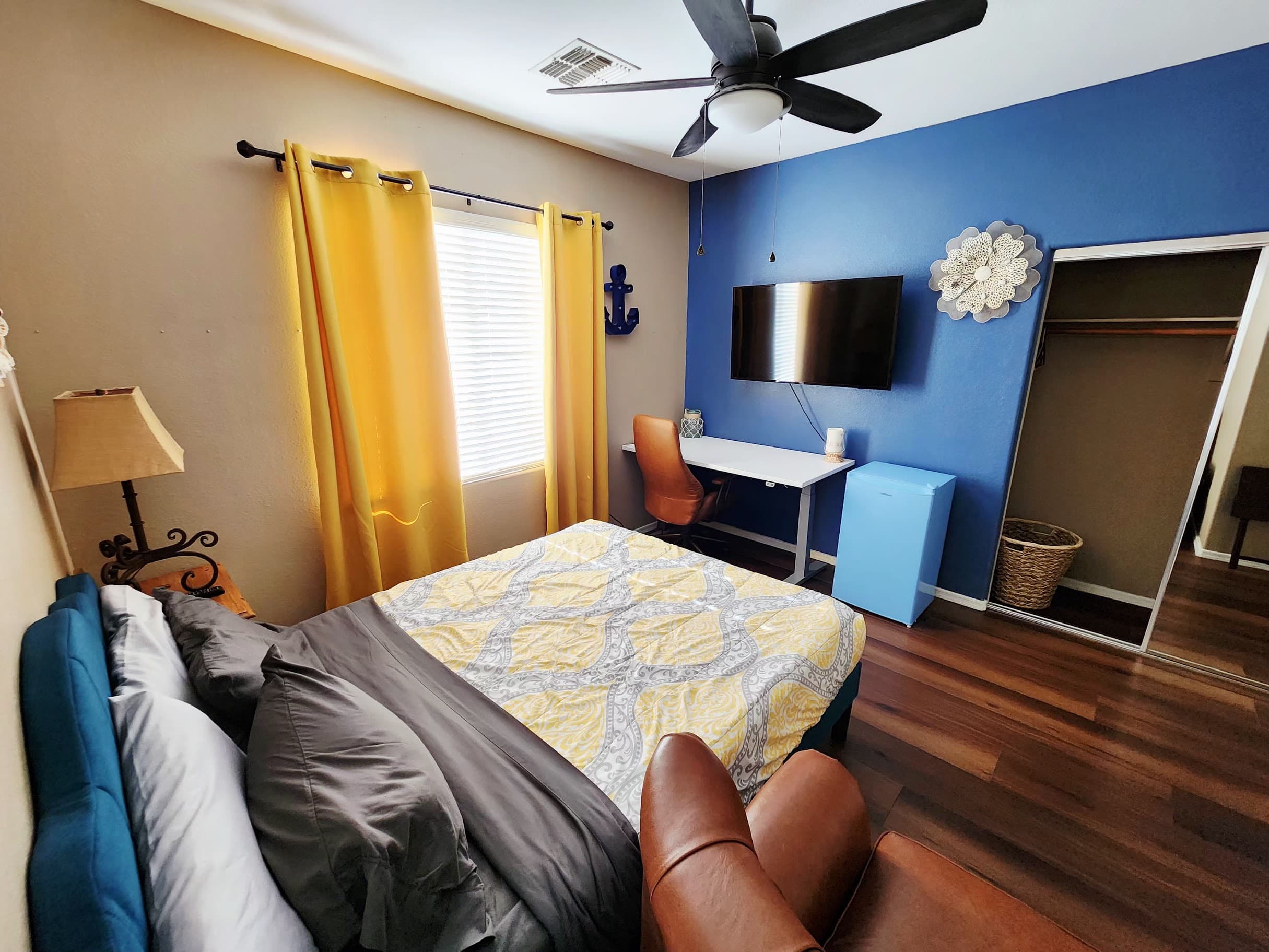 Pirate Cove is Natalie's personal home — a fully designed, five-room bohemian retreat in Surprise, Arizona. Bold colors, layered textures, and the signature wavy motif run throughout the shared spaces: a vibrant kitchen, a warm and welcoming living area, and a backyard made for unwinding. Every detail is intentional. The kind of home that feels genuinely lived-in and loved.