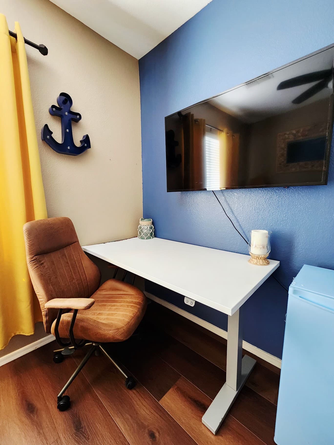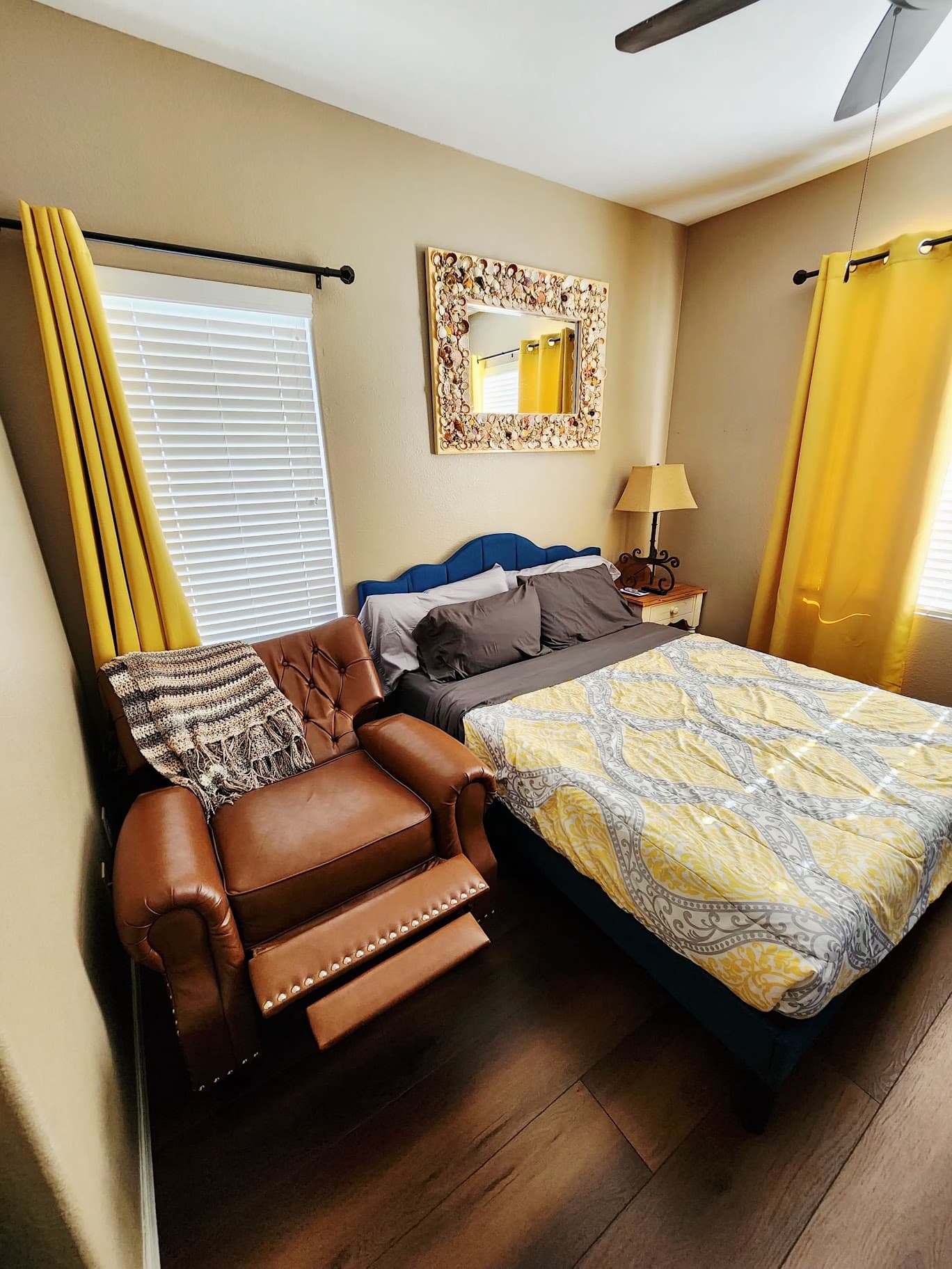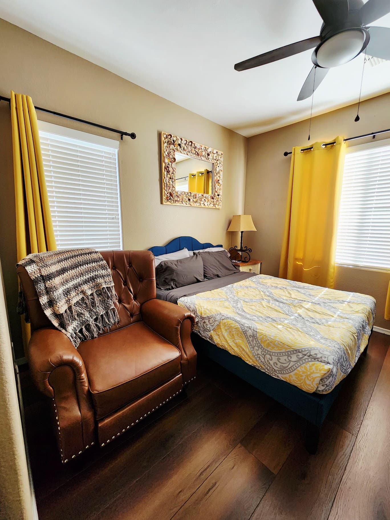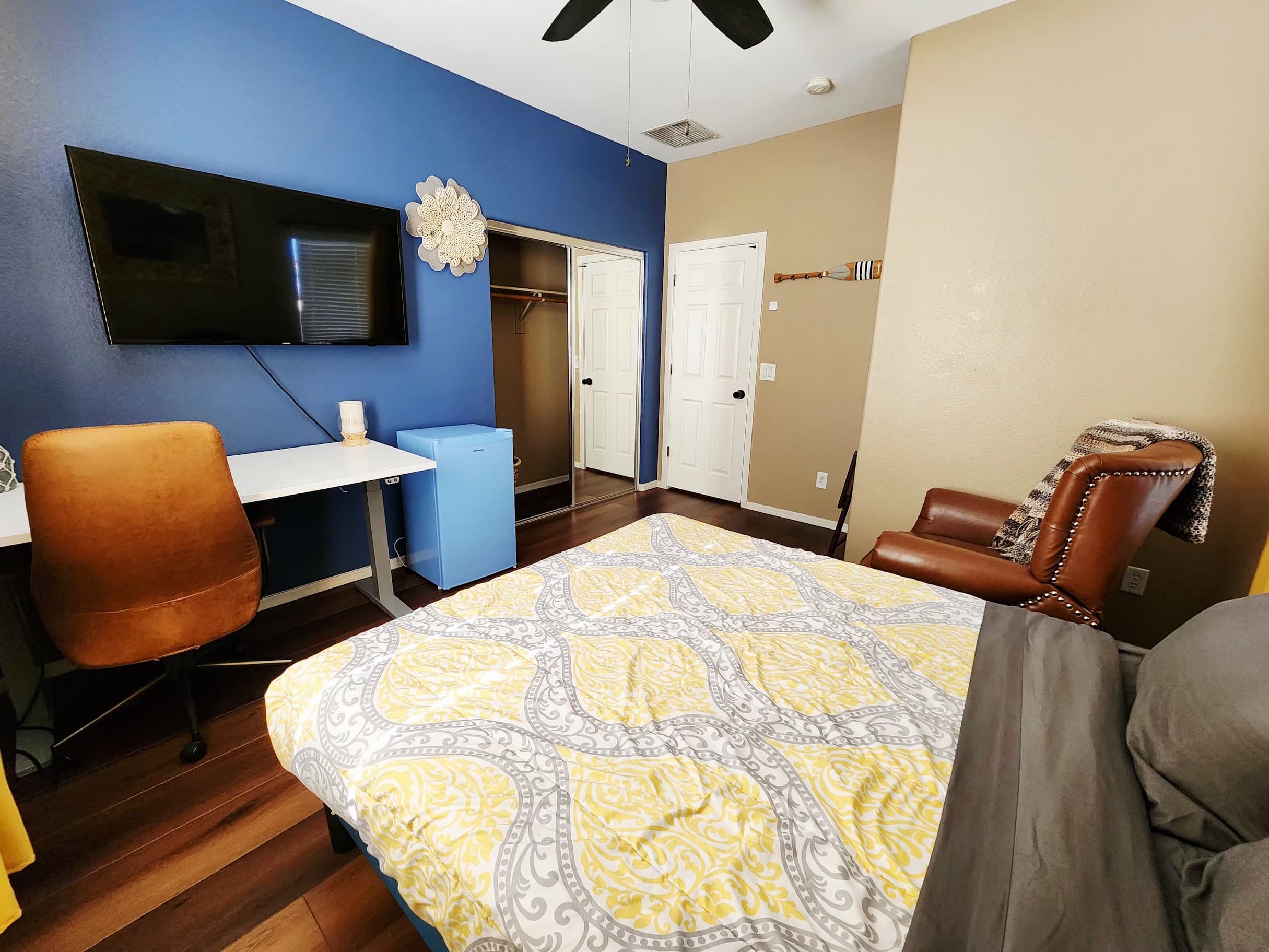 Pirate Cove is Natalie's personal home — a fully designed, five-room bohemian retreat in Surprise, Arizona. Bold colors, layered textures, and the signature wavy motif run throughout the shared spaces: a vibrant kitchen, a warm and welcoming living area, and a backyard made for unwinding. Every detail is intentional. The kind of home that feels genuinely lived-in and loved.