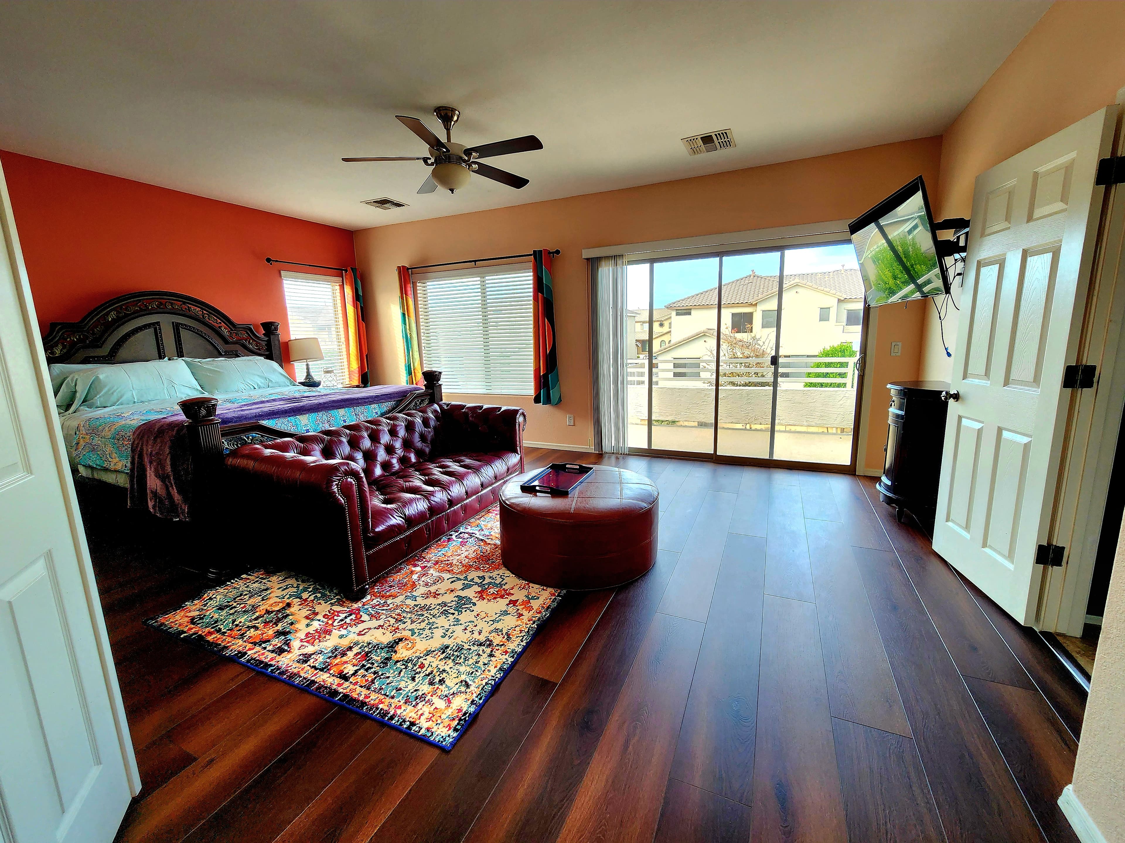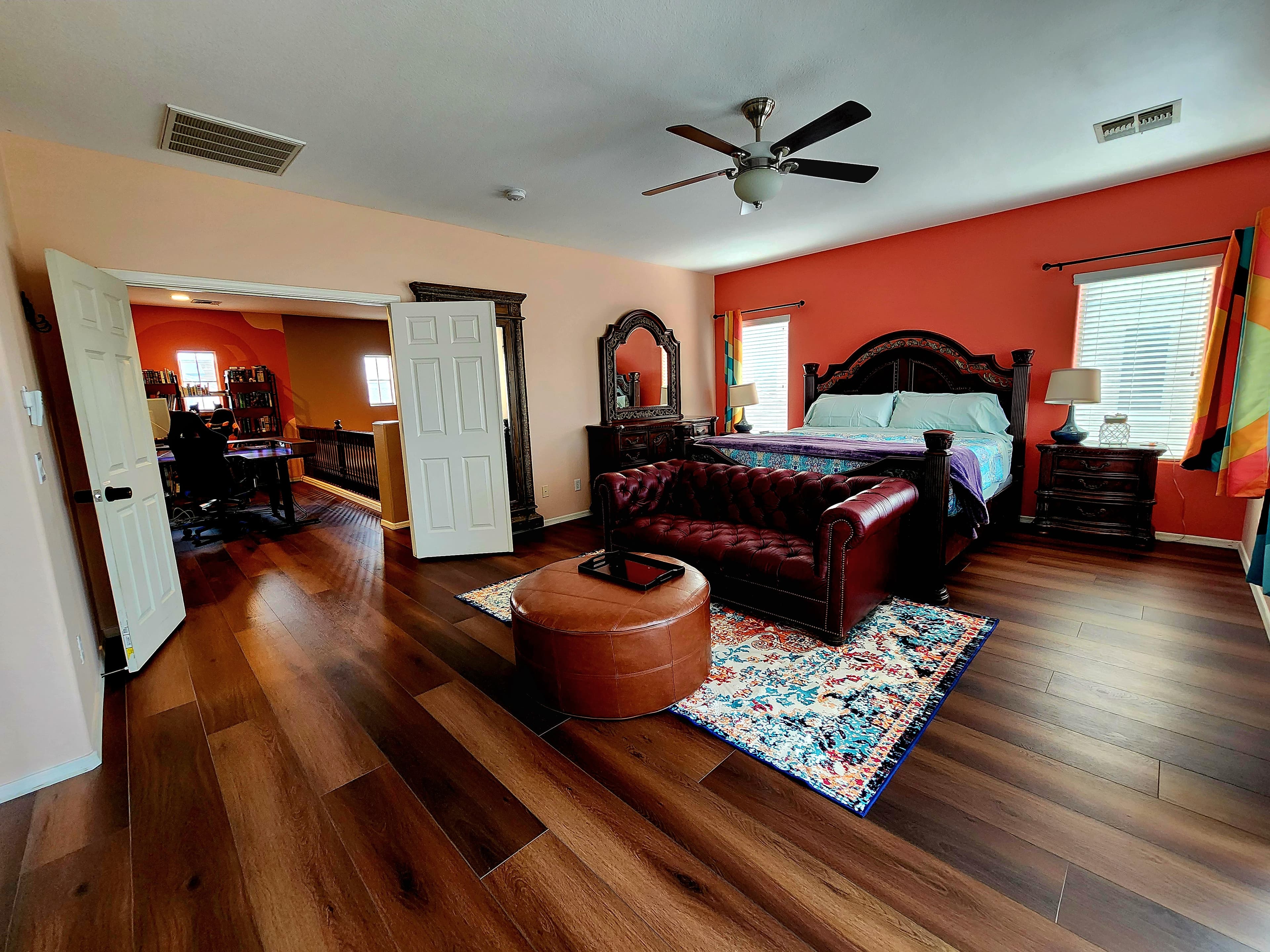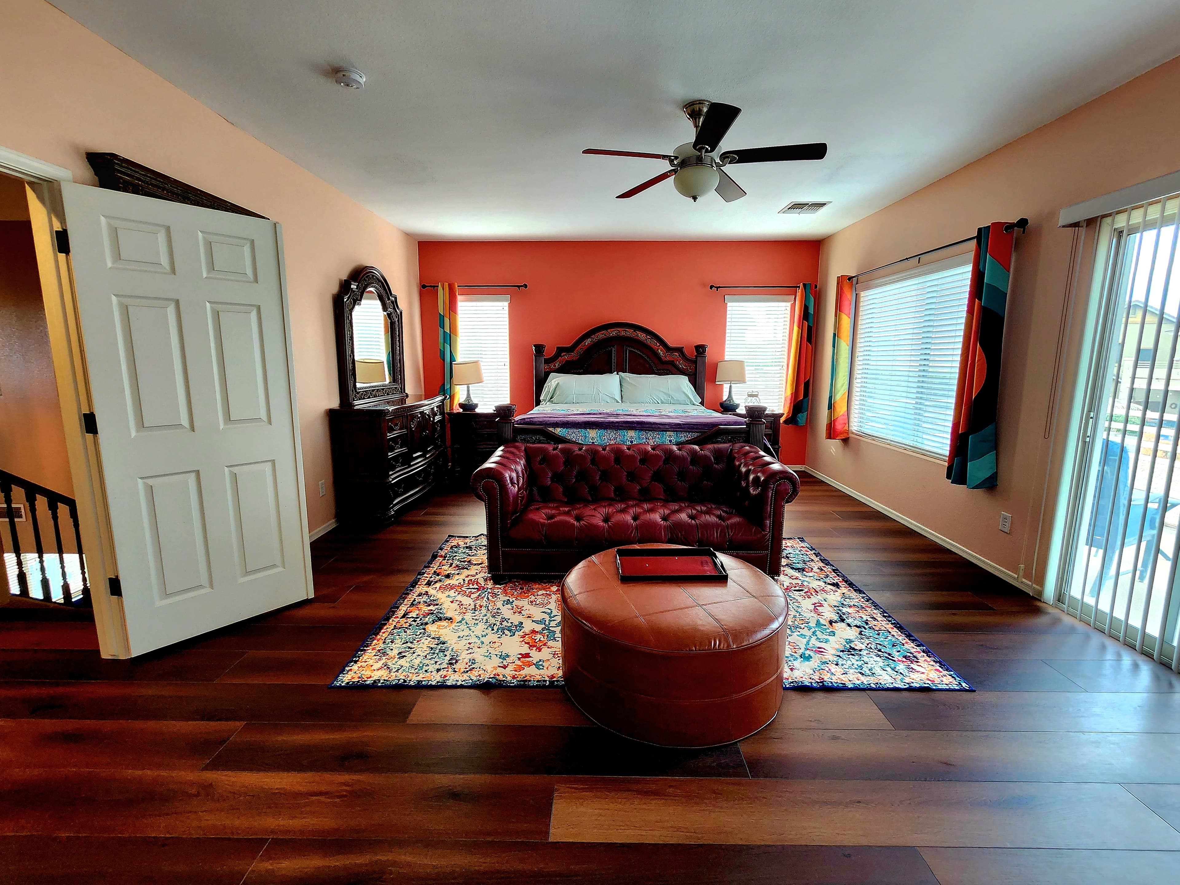 Natalie's own master suite, listed for guests during her long-term travels. The room that inspired the entire aesthetic of Pirate Cove — moody, warm, and completely one-of-a-kind. Deep burnt orange walls, a burgundy leather Chesterfield sofa, and teal wavy curtains that are literally the origin of the squiggle motif running through the whole home.