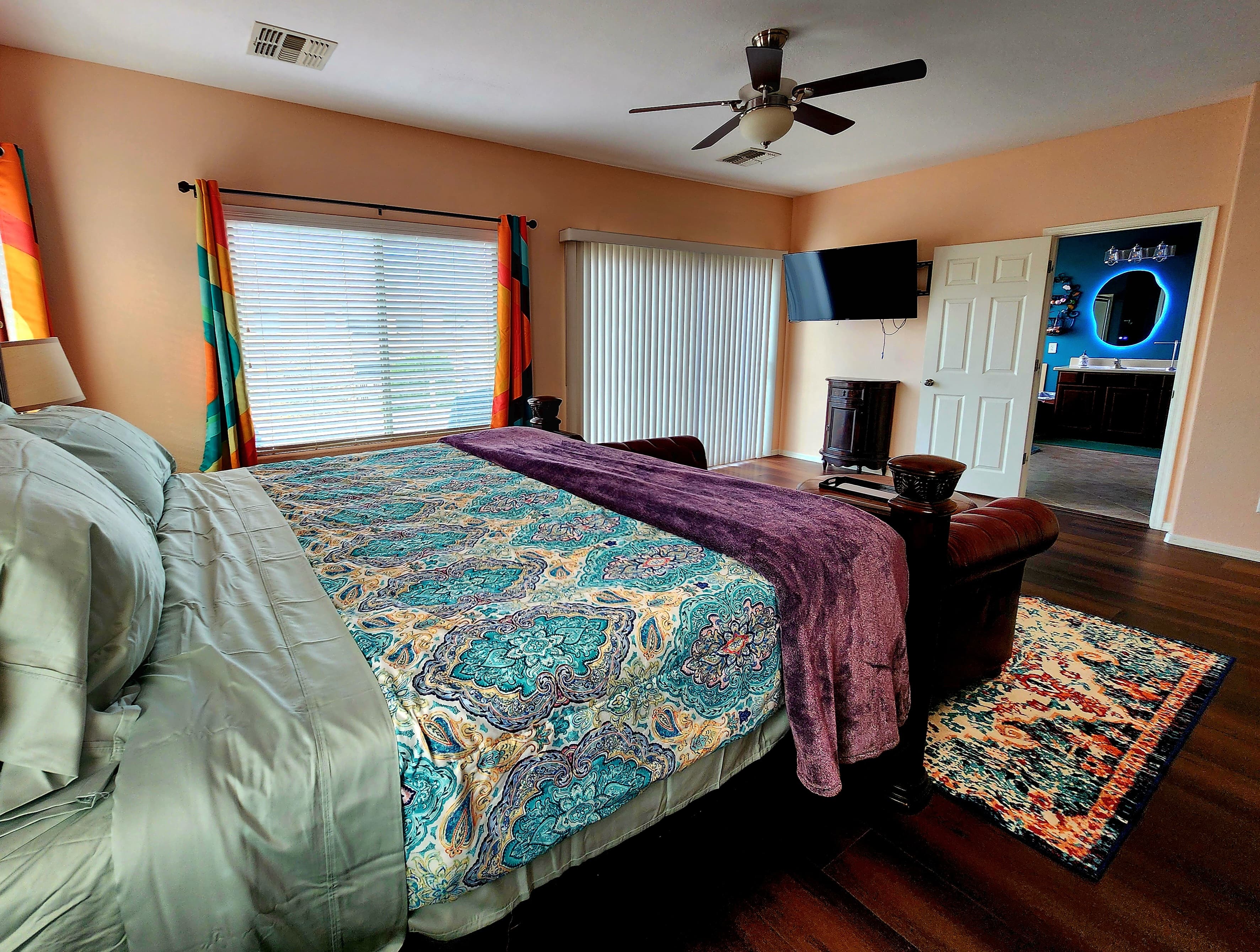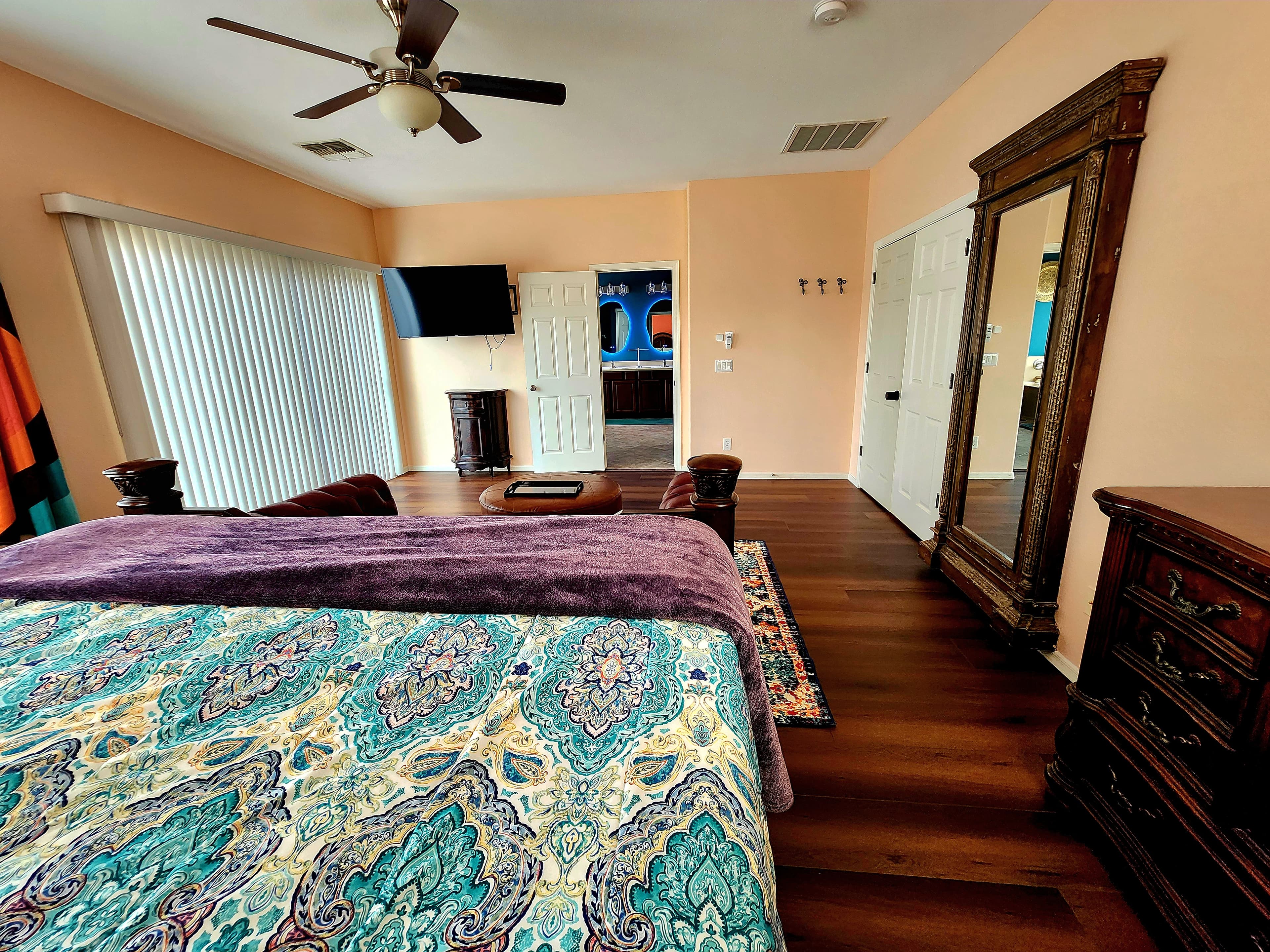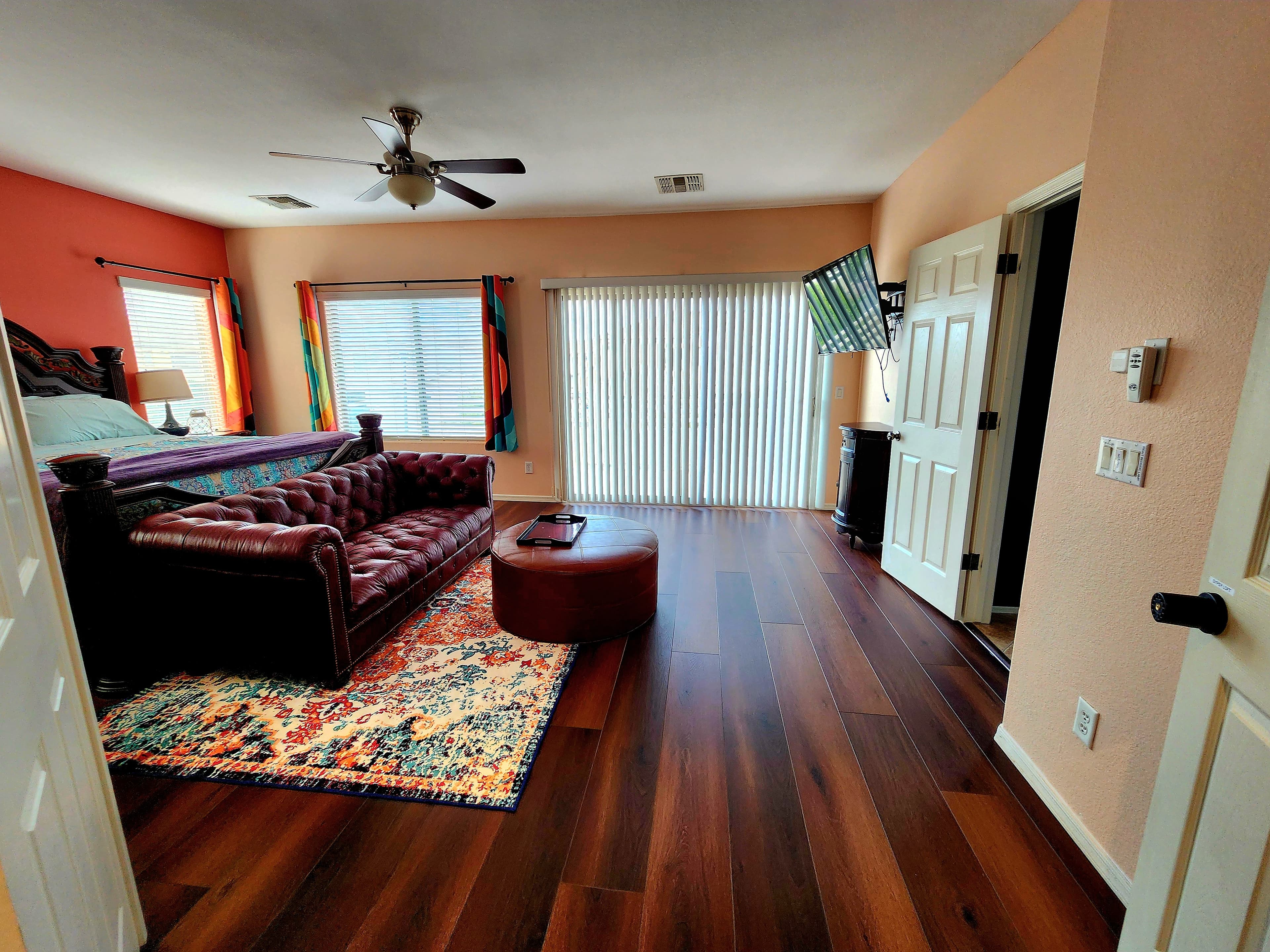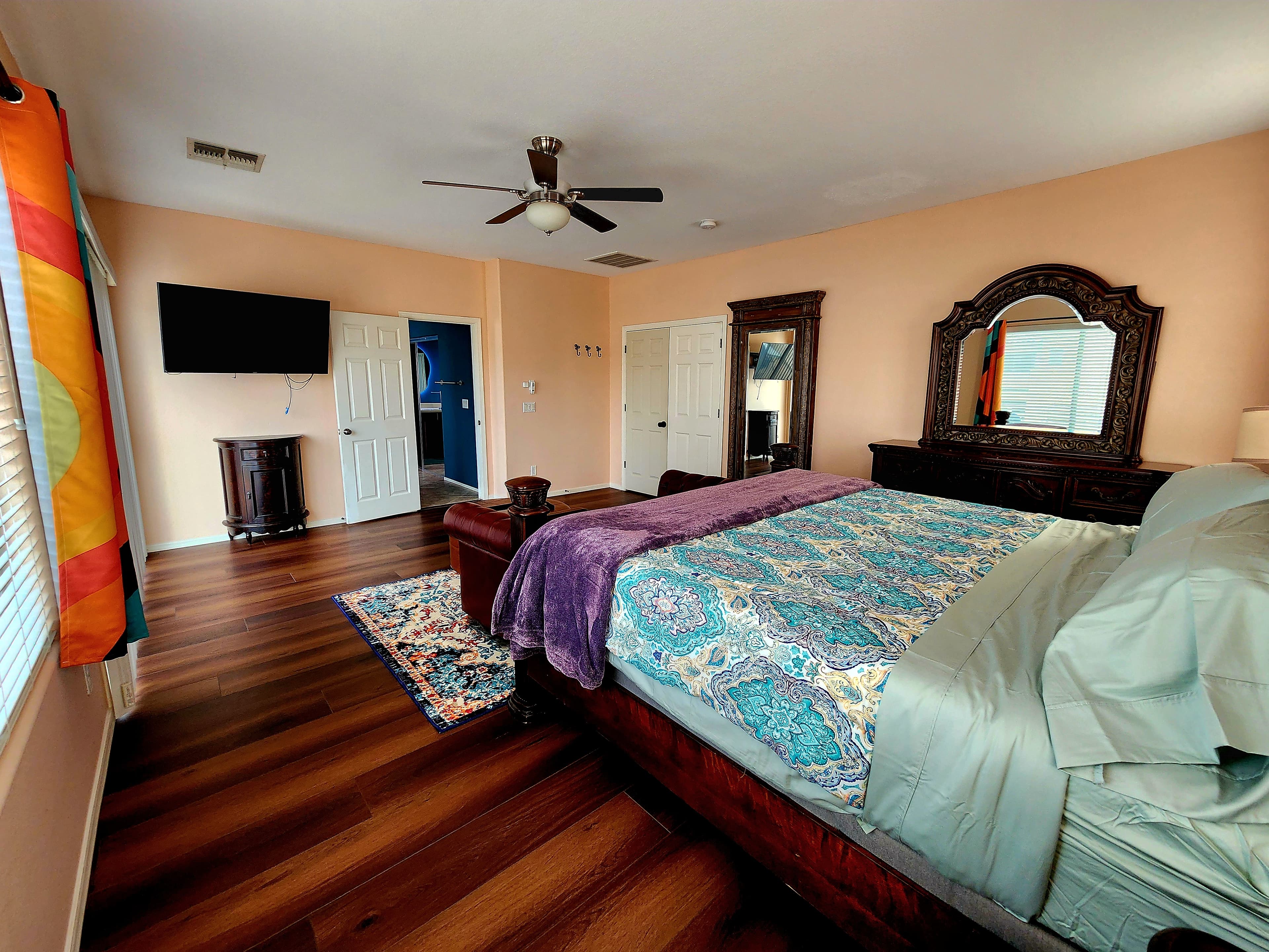 Natalie's own master suite, listed for guests during her long-term travels. The room that inspired the entire aesthetic of Pirate Cove — moody, warm, and completely one-of-a-kind. Deep burnt orange walls, a burgundy leather Chesterfield sofa, and teal wavy curtains that are literally the origin of the squiggle motif running through the whole home.