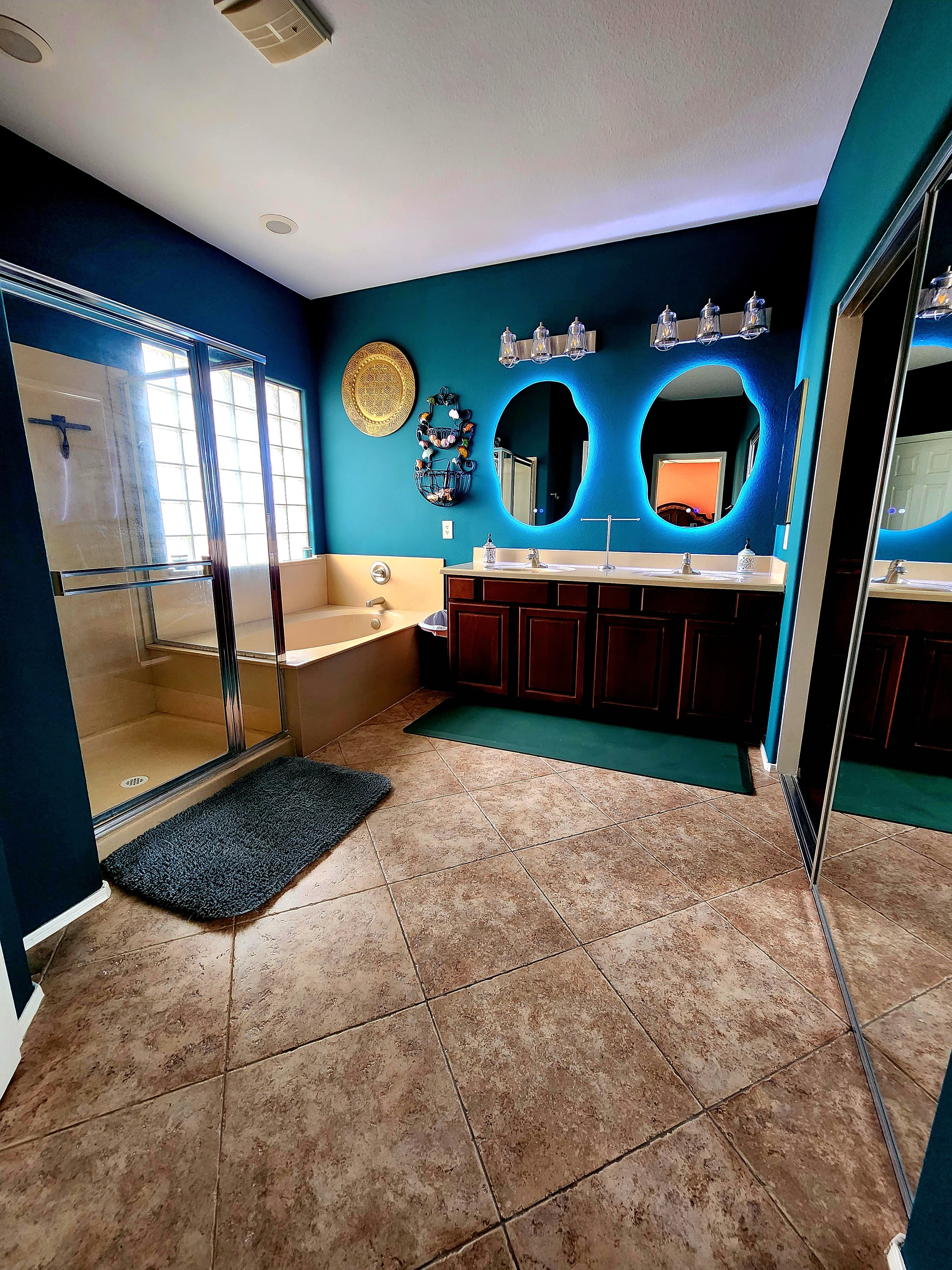 Private en-suite bathroom with a double vanity, separate shower, and soaking tub. Bold emerald tones set the mood, while the abstract backlit fog-free vanity mirrors add a striking, spa-like finish.
