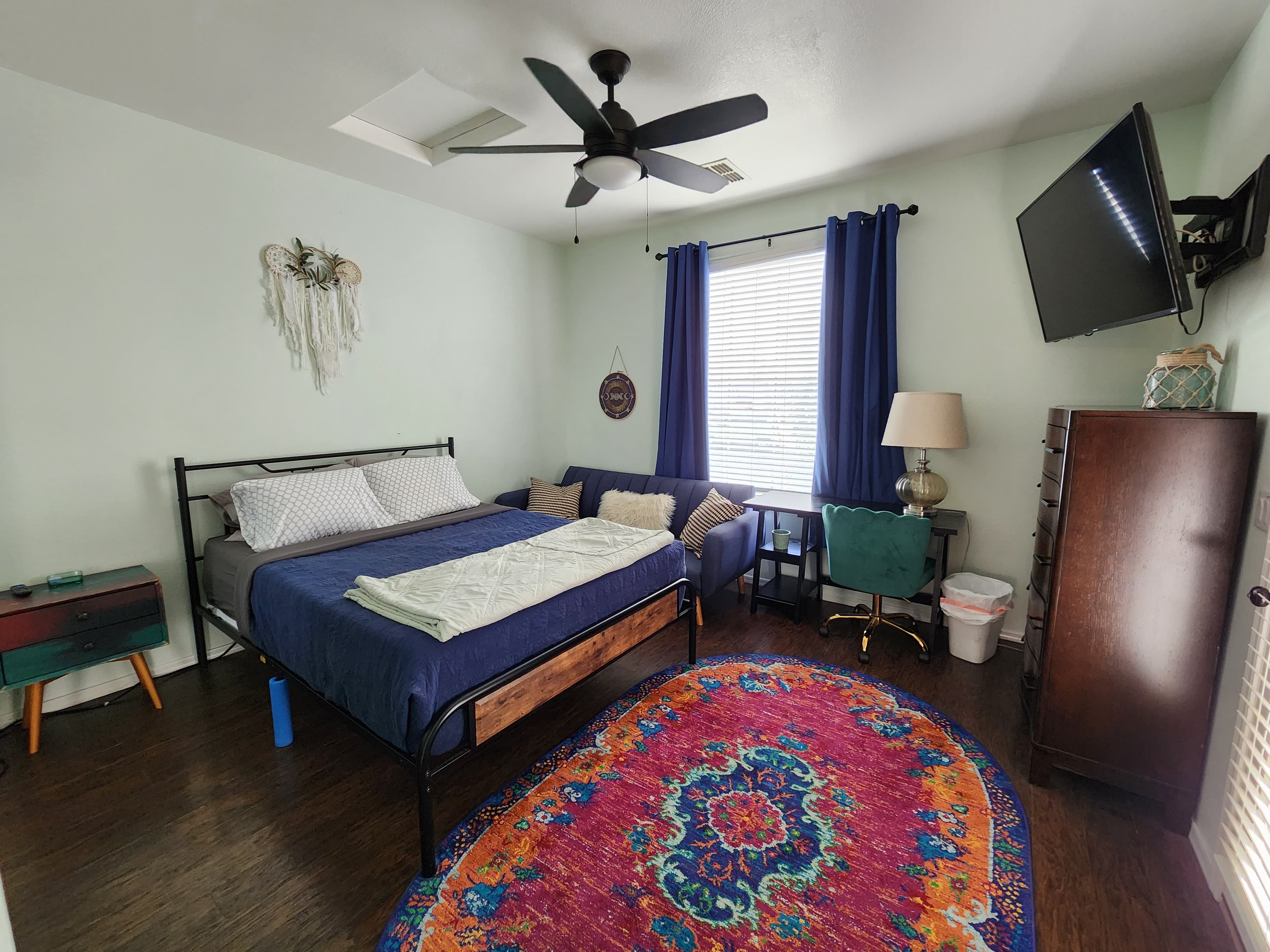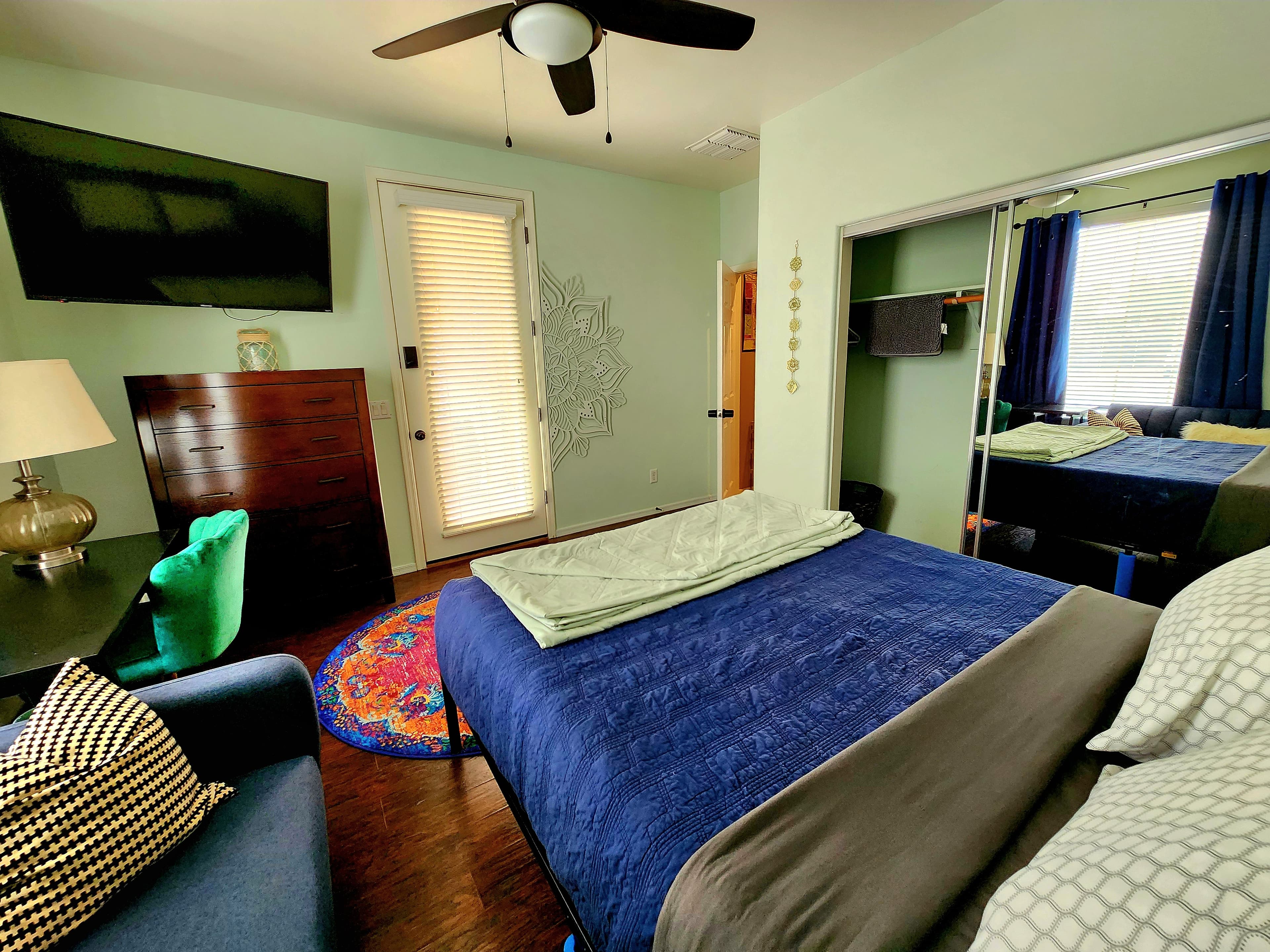A peaceful retreat with its own private entrance — come and go completely independently. Earthy sage tones, chakra symbols, and mandala art create a grounding, meditative atmosphere. The emerald chair adds just enough richness to keep it from feeling sparse.